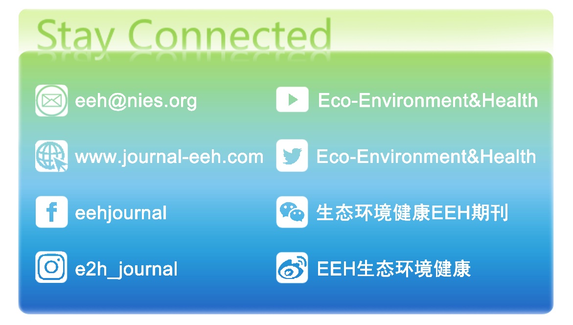 Eco-Environment & Health(EEH)期刊是由里番 和生态环境部南京环境科学研究所共同创立的英文期刊,以期打造成为环境健康领域旗舰期刊。 EEH聚焦大健康(One Health)理念,助力绿色可持续发展,关注生态、环境与健康之间交互作用的过程、机制与干预,范畴包括生态安全、环境健康风险、生态与环境修复。重点方向为:生态与生物多样性保护,新污染物的环境归趋与生物过程,人体暴露与健康效应,环境风险评价、管理与调控。
