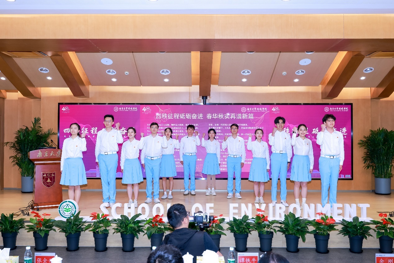 学生代表朱博阳分享了从本科到研究生阶段的学习经历和感受。他表示,学校和学院给学生们提供求知求学的广阔平台,让学生们在思想情操、意志品行、专业知识、实践能力等方面都收获了成长。作为一名南大环境人,将坚决贯彻落实习近平总书记"报效国家、服务人民"的核心要求,时刻牢记"再创佳绩、争做表率"的殷切期望,争先实干,砥砺奋进,为我国生态文明事业和美丽中国建设贡献青春力量。